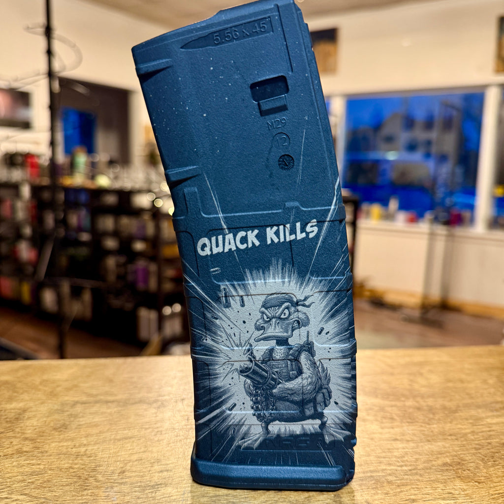 This digital LightBurn file features a precision-designed QUACK KILLS design tailored for .223 30-round PMAGs. Purchasing grants you the file along with a commercial license to produce and sell finished products using the design. Please note, redistribution or resale of the file itself is strictly prohibited. Ideal for professionals seeking a distinctive, high-quality graphic to enhance tactical gear or custom magazines with legal compliance.
